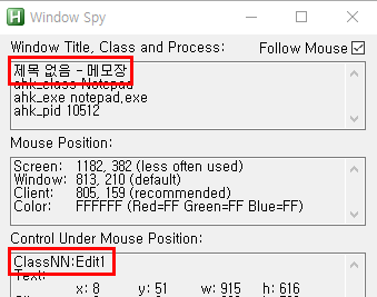 메모장의 WinTitle은 [제목 없음 - 메모장]이고, 입력칸의 ClassNN은 [Edit1]이네요.