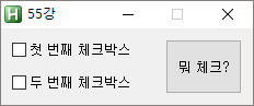 g레이블도 적용시켜볼까요? 이 경우에 버튼을 누르지 않아도 체크박스의 값이 바뀔때마다 대화 상자가 출력되겠네요.