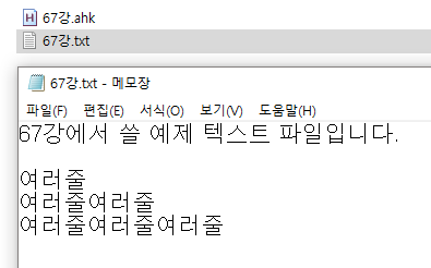 스크립트와 같은 위치에 "67강.txt" 텍스트 파일을 만들고 내용을 아래처럼 작성한 후, 저장을 해주세요.
