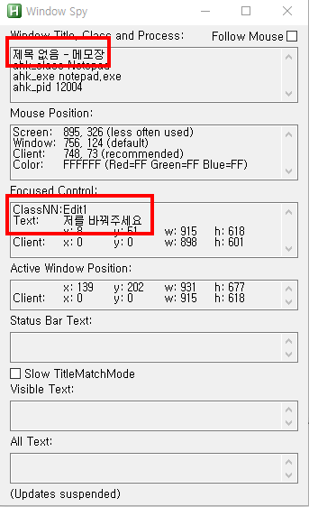 WinTitle과 ClassNN은 아실테고, ClassNN밑에 "Text"라는 부분이 있습니다. 메모장에 입력한 글이 써져있네요.