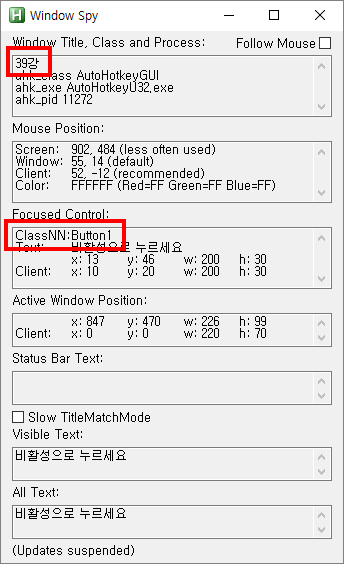 WinTitle은 [39강]이며, 버튼의 ClassNN은 Button1이네요.