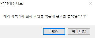 MsgBox, 4, 선택해주세요, 제가 새벽 1시 현재 라면을 먹는게 올바른 선택일까요?, 10