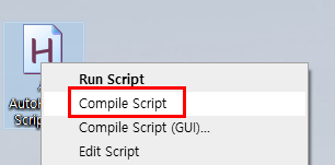 우리가 실행시킨 것은 스크립트 파일입니다. .ahk 확장자를 가진 파일이라는 것이죠. 우리는 이를 실행 가능한 파일, 즉 .exe 확장자로 변환 후 배포해야 합니다. 스크립트 파일은 오토핫키가 설치되어있지 않은 컴퓨터에선 실행이 되지 않기 때문입니다. 자신이 만든 프로그램을 남들이 쓰도록 해야된다면, 남들이 오토핫키를 설치하지 않고도 바로 사용할 수 있도록 컴파일 후 배포해야합니다.