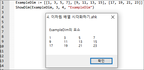 - 자신이 만든 테스트용 배열의 모습에 따라 정답과 출력 예시는 다를 수 있습니다. 배열의 모습이 정상적으로 시각화되었다면 성공입니다. (ShowDim() 함수를 만드는 것이 문제의 목적)