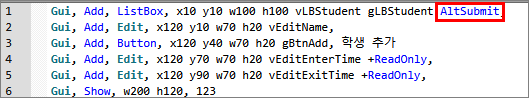 위와 같이 ListBox에 AltSubmit 옵션이 붙어있을 경우, ListBox의 v레이블 값은 선택한 리스트 항목의 '텍스트'가 아닌 '순번'을 가집니다. 즉, 위 출력 예시 사진에서 세 항목을 각각 선택했을 때 v레이블 값은 "홍길동", "김철수", "김영희"가 아니라 1, 2, 3을 가진다는 것이죠. 이를 참고해서 문제를 다 푸신 후, ListBox[1].enterTime 등과 같이 MsgBox로 출력해봄으로써 테스트를 원활히 하실 수 있습니다.