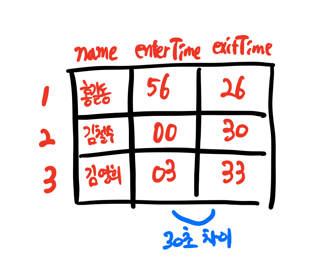 - 배열의 이름은 무관하나, 각 행마다 이름(name), 입실시간(enterTime), 퇴실시간(exitTime)을 저장함. 행 번호는 1, 2, 3, ... 처럼 1씩 증가함. 즉, 이름과 관계없이 1번 학생, 2번 학생등으로 취급할 것