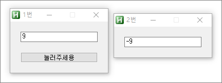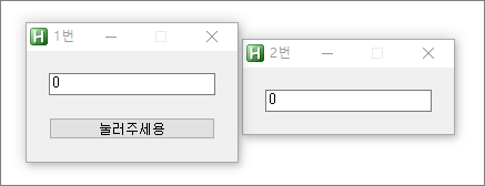 아래 예제는 버튼을 누를 때마다 "첫번째 창 Edit의 숫자는 올라가고, 두 번째 창 Edit의 숫자는 내려가는 프로그램"입니다. 두 GUI 중 아무 창이나 닫으면 프로그램은 종료됩니다.