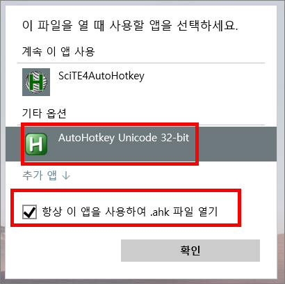 3. [AutoHotkey Unicode 32-bit]와 [항상 이 앱을 사용하여 .ahk 파일 열기] 를 사진처럼 선택하고, 확인버튼을 누릅니다.