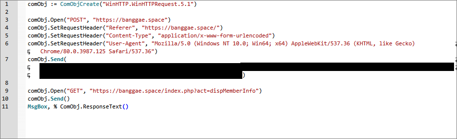크롤링이 되지 않는 이유는 짐작 가실겁니다. 로그인을 하지 않았기 때문에, "회원 정보"에 접근할 권한이 없는 것입니다. 우리가 웹 브라우저에서 로그인을 했어도, 오토핫키 소스에서 새로 통신하는 그 부분은 비로그인 상태인 것입니다.