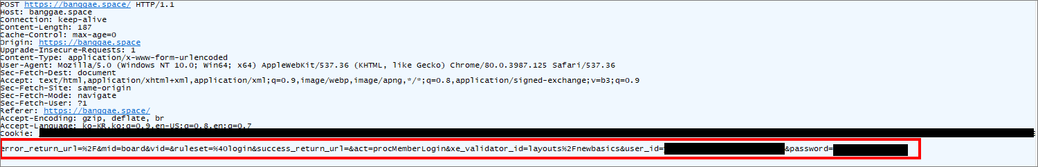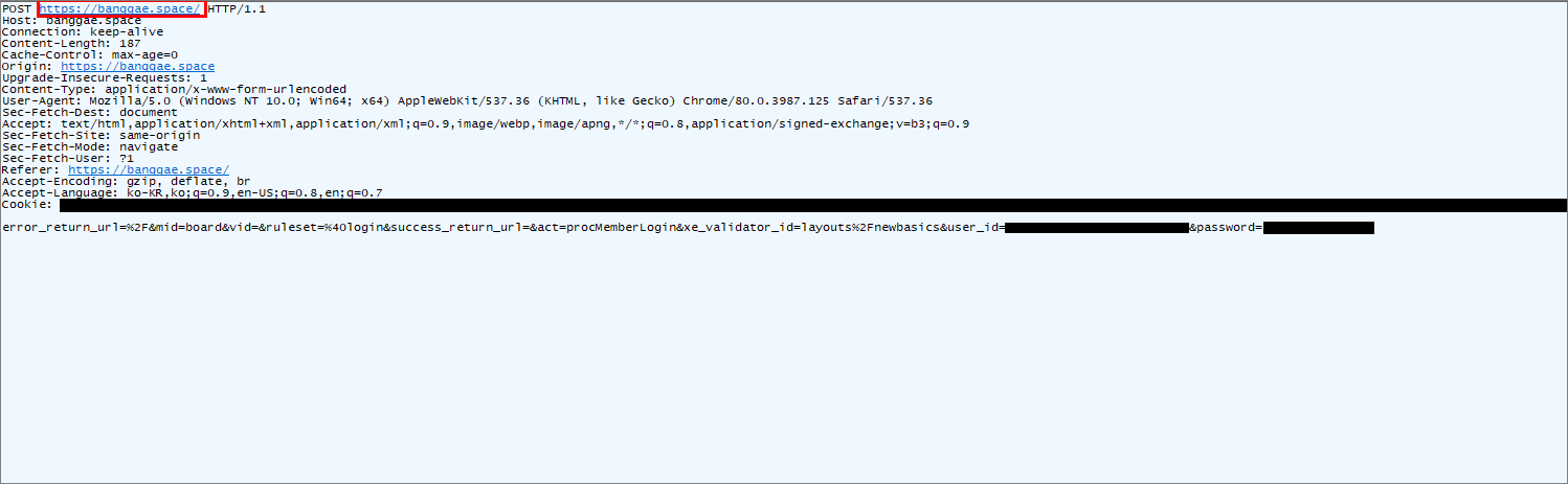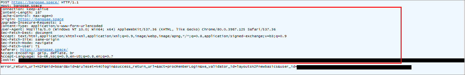 저 줄이 POST를 통해 넘어가는 값이구요, 가려준 부분엔 아마 로그인에 성공한 본인의 아이디와 비밀번호가 있을 것입니다. 그러니까, 우리가 웹 상에서 로그인 버튼을 누르는 순간 저 데이터가 전송된다는 뜻입니다.