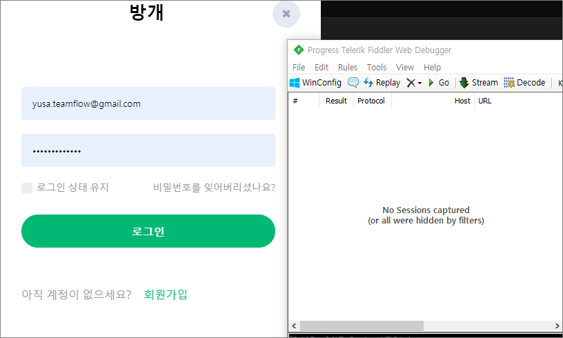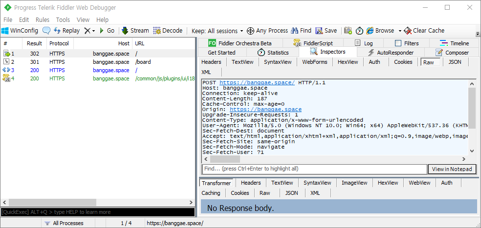 전 4가지의 통신 목록이 뜨는데요, 필요한 정보가 이렇게 수집되었으면 일단 피들러 하단의 Capturing 버튼을 눌러서 피들러가 다른 통신 내역을 가져오는 것을 중지해줍시다. 다른 통신 목록이 들어오면 헷갈리거든요.